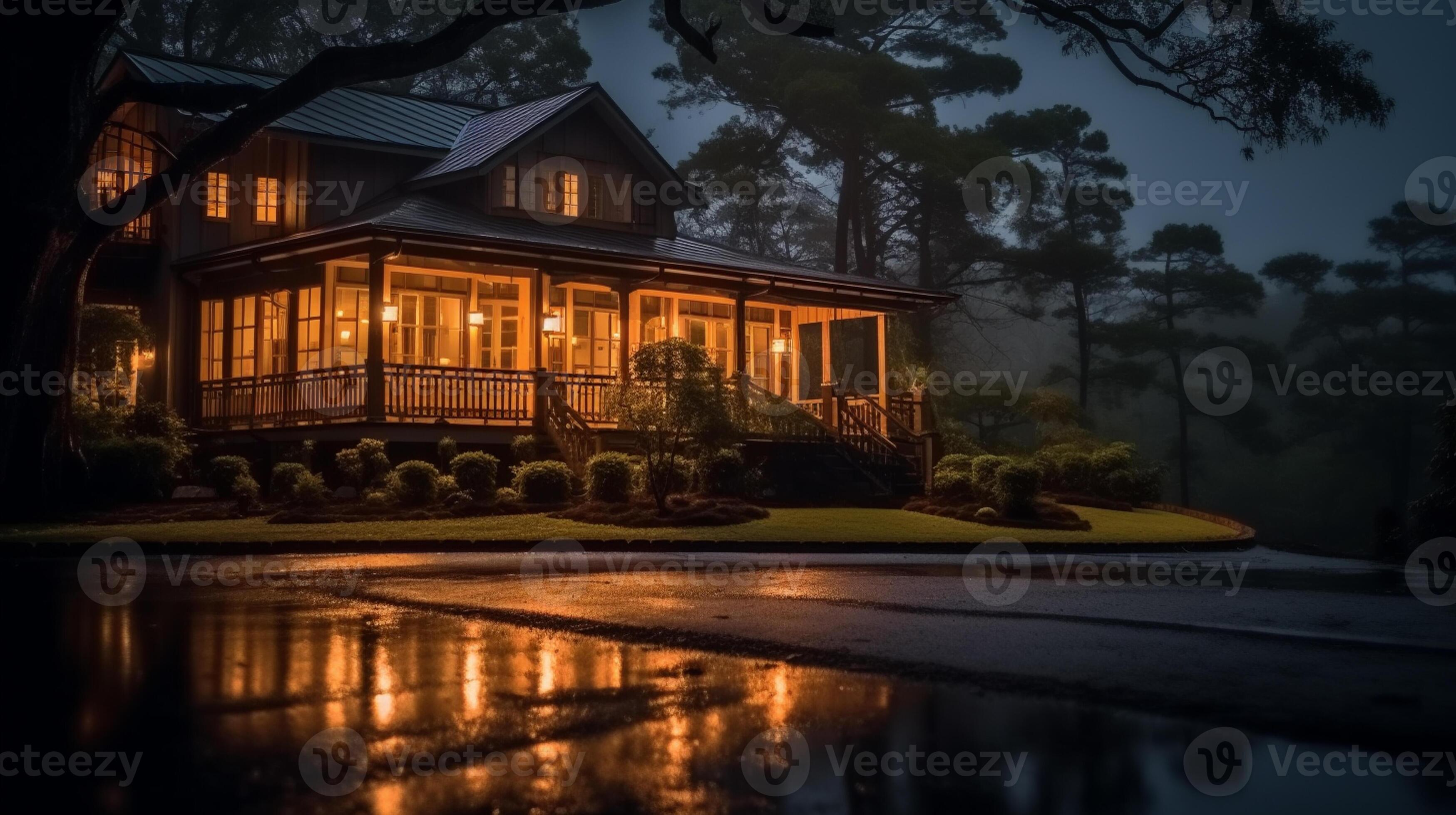 nighttime view of a house with a porch and a porch lit up generative